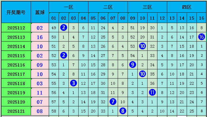 上期蓝球开出号码08,近十期蓝球在一区开3枚,二区开出号码2枚,三区开出4枚,四区开出1枚,区间比3:2:4:1,本期推选蓝球出当今四区,重心出动16。