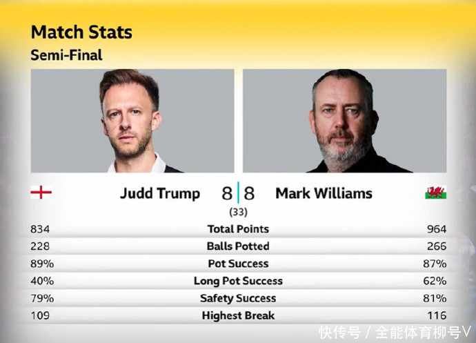 赵心童特出奥沙利文半决赛的第一阶段,两东说念主势均力敌打成4-4。而威廉姆斯与特鲁姆普的这场半决赛第一阶段前四局,两位球员亦然势均力敌,两边战成2-2平局。