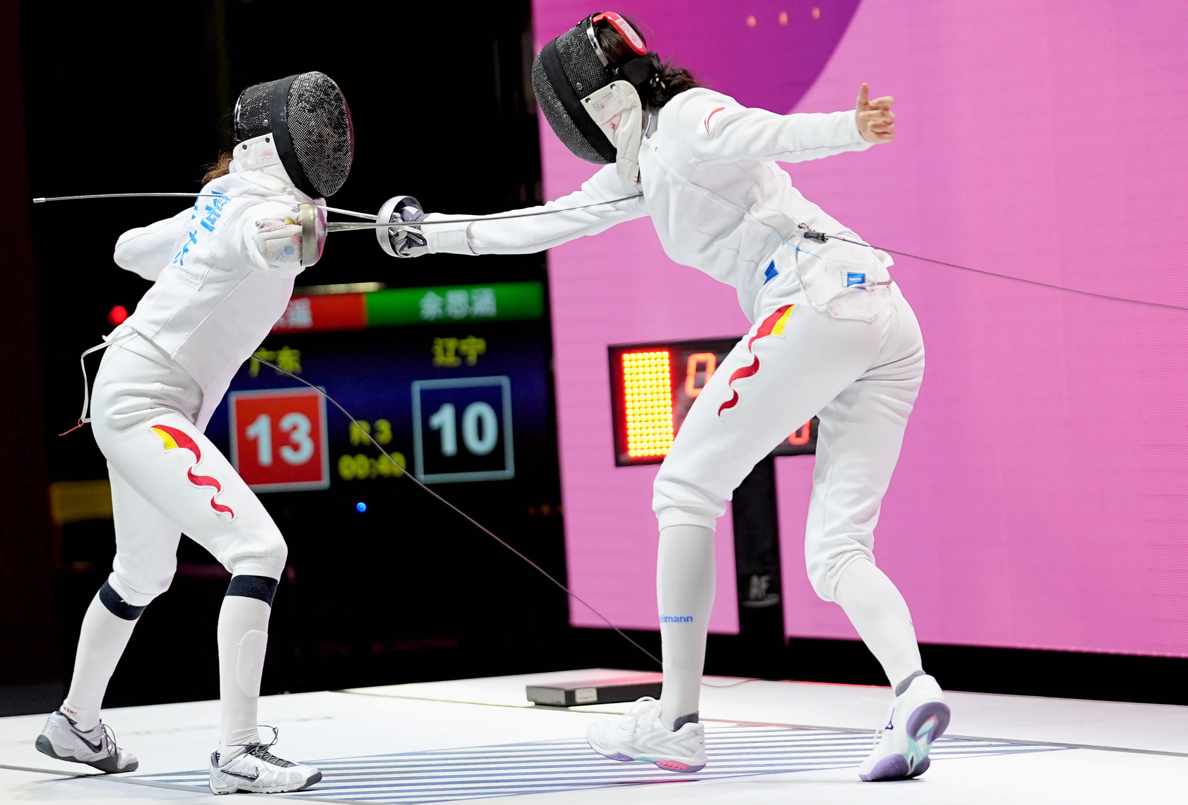 吴采遥(左)在决赛中得分吴采遥在女重个东谈主赛半决赛中以13:12险胜山东队侯光娟,决赛中对阵辽宁队余念念涵。吴采遥领先得分,随后两东谈主比分较为胶著,直到第三局中段吴采遥连得3分获取14:10的耕作。尽管余念念涵纠合提拔3个赛点,吴采遥依然有惊无险地以15:13拿下比赛,继2023年后再次夺得天下锦标赛个东谈主冠军。